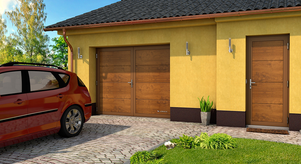 Dvoukřídlová garážová vrata, hliníkový rám barva hnědá RAL 8003, výplň PU sekce 40mm zlatý dub , rozměr 2220x2090mm, prosklení v horní části. Cena 40000,-Kč bez DPH